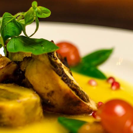 Maispoulardenbrust gefüllt mit Datteln und Pistazien auf Safransauce, an Gemüse und Reis