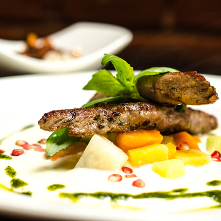 Lammfilet auf Schafskäsesauce mariniert in Thymianolivenöl an gedünstetem Gemüse auf Basmatireis.